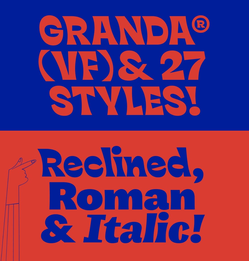 Rooted in the Grotesk genre, Granda is a sans-serif typeface with lively proportions that bring warmth to the text. Granda Reclined is a playful alternative, counterbalancing the italic.
