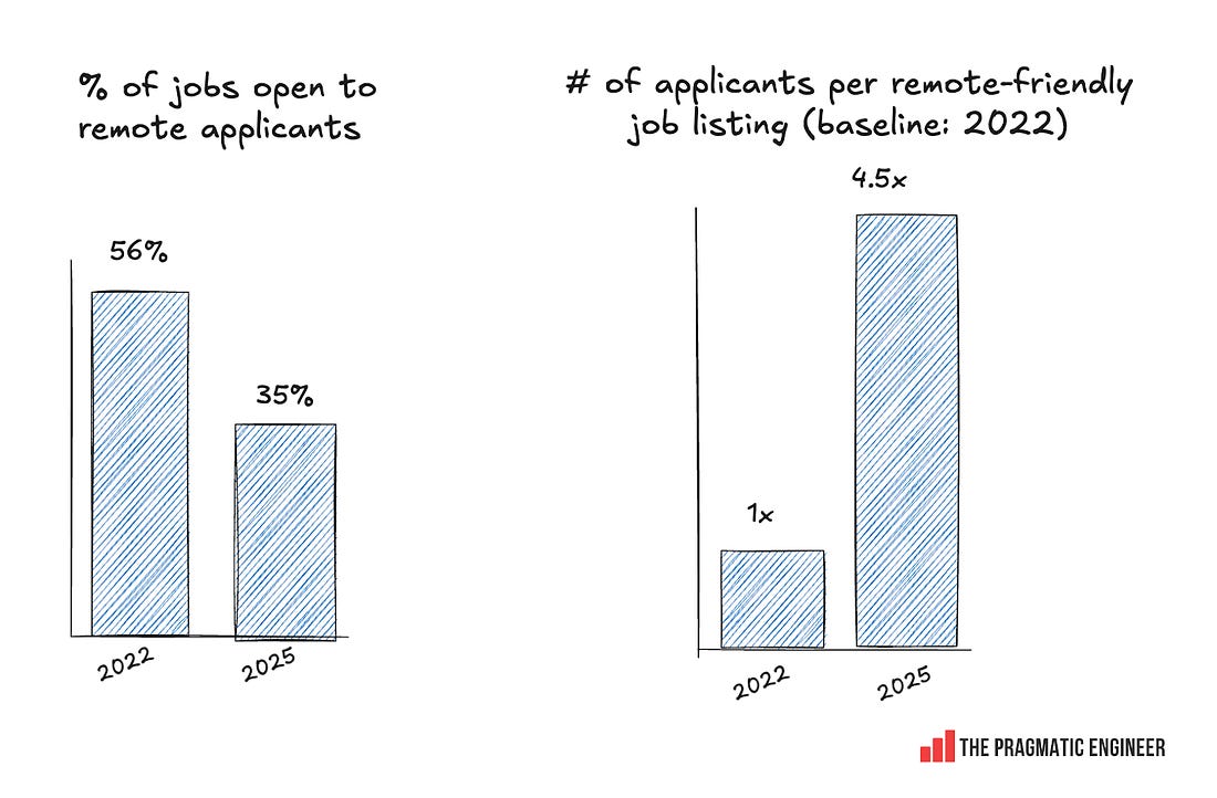 “35% of engineering jobs are open to remote candidates. This is down from a peak of 56% in 2022. However, remote engineering jobs get 4.5x as many applications compared to 2022.”