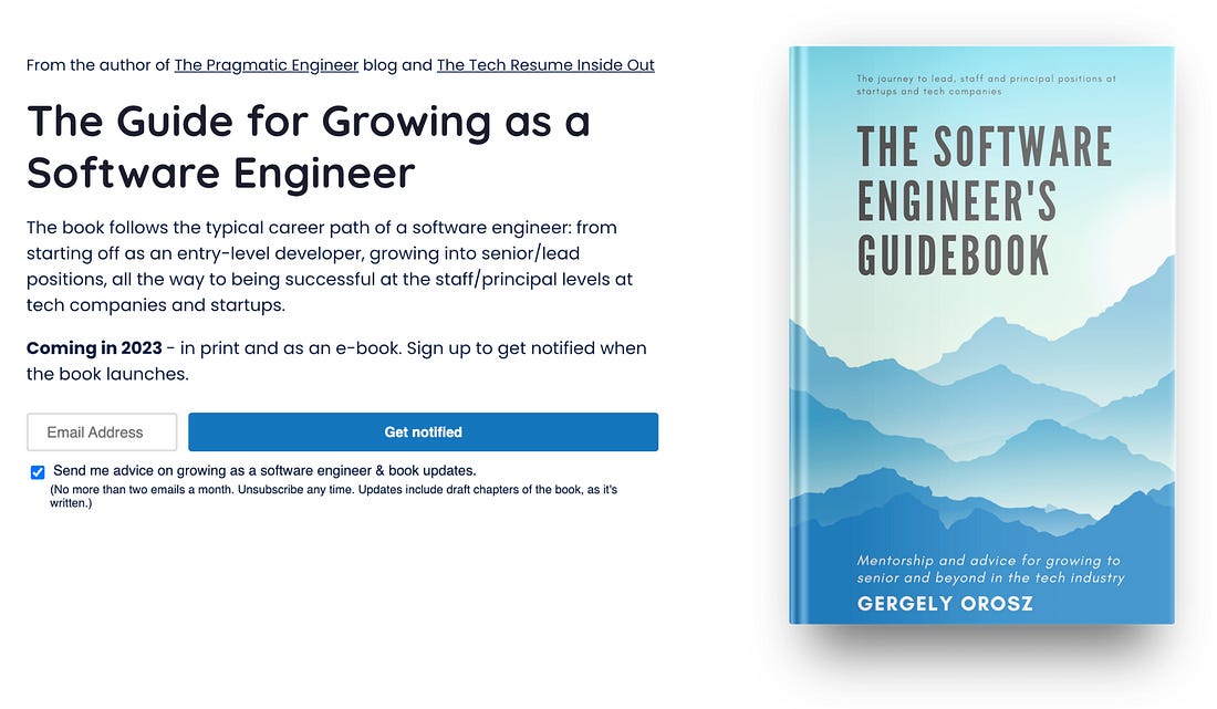 There’s a long tail of ebook and audiobook platforms, and it makes sense to use an aggregator service that publishes to most, if not all of them, and which then sends a combined payout, instead of lots of small payments from each platform. Don’t forget the launchGoing with a publisher has the benefit that they coordinate launch activities, and also list your book on their New Releases pages, which leads to added awareness. Superior publishers also reach out to potential reviewers, and are hands-on in helping with the launch. I knew I couldn’t count on launch support, so built a landing page where I collected emails of people who wanted to know when the book was released. To incentivize this, I provided details about the book, and the table of contents. In hindsight, this was one of the best things I did: a good chunk of sales at launch came from people who received the email that the book was ready for purchase. Here’s how the book’s website looked, back then. Another approach that worked well was having a dedicated social media account for the book, where I shared drafts while working on certain chapters. I was surprised by how many reshares a page or two of the work-in-progress book got, like this one.