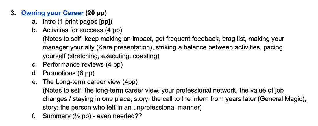 Weighted table of contentsOne very useful thing I took from Manning’s process is to start the book with a table of contents, where you estimate the rough number of pages one section will be about. This is helpful because the published version should not be too long or too short, so this helps set its scope and how topics should be tackled. Here is an example of the weighted table of contents for one chapter: This exercise resembled estimating the size of a piece of work during the planning for a software project, and provided a sense of what the longer and shorter parts of the book would be. Write, write, writeThe biggest part of writing a book is… writing it. I tried to have some regular cadence of writing, but struggled to get into one. I ended up making progress in bursts, and shared drafts on social media – like this one on healthy and unhealthy teams. This generated more ideas and I continued writing. It’s easy to get distracted and procrastinate. A 400-page book is too large a project to take on in one go, and sometimes parts of the book change shape: an estimated 4 pages on something can turn into 20 pages a week later. It was like treading water: not making much progress with the book as a whole and being distracted by interesting topics. Starting The Pragmatic Engineer Newsletter to finish the bookTwo years into writing the book, its completion was forever 6 months away. I realized my writing process, with no publisher involved, was inefficient and unfocused. In August 2021, I started The Pragmatic Engineer Newsletter with the hope that writing a weekly newsletter would speed up completion of the book. My thinking was to send out a draft version of a part of the book as a newsletter every few weeks. The idea was sound, but I quickly realized that online newsletter issues can be a lot more in-depth than a chapter in a book can be, due to the issue of space constraints. Also, newsletters are timely by nature (covering what’s happening, right now), whereas a book often covers ideas that remain relevant for years. I am thankful to have started The Pragmatic Engineer Newsletter, but doing so didn’t hasten the publication of The Software Engineer’s Guidebook. It actually delayed it by another two years. Tools I used for self-publishingThere’s many tools available for writing a book, not including new AI tools for generating ideas – or even doing the writing in certain cases. Here’s the tools I chose: