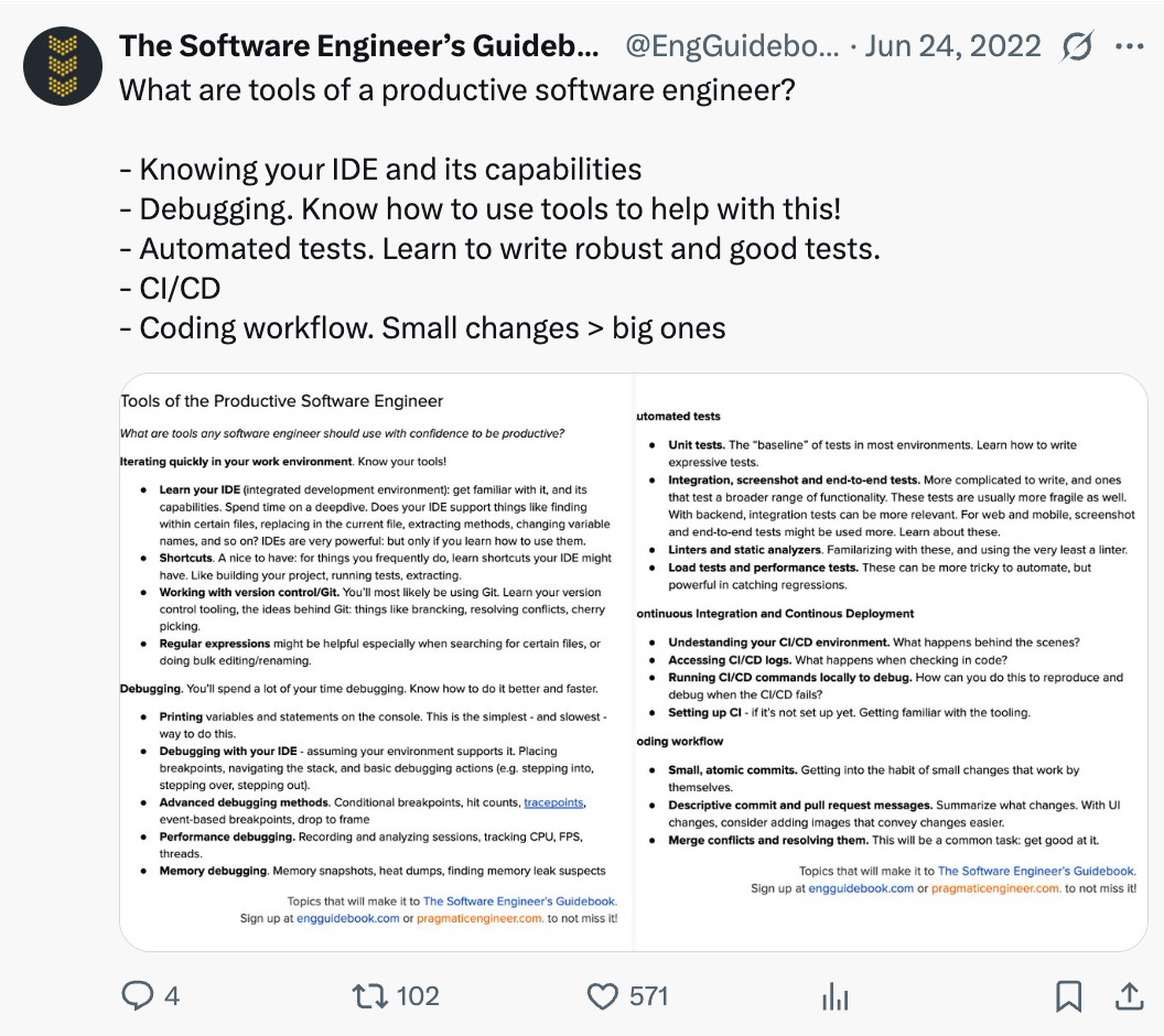 That Amazon has a take rate of 75% for audiobooks and 70% for Kindle ebooks (those priced above $10) and still controls most of the market, makes this segment look like a monopoly. I offer my ebooks and audiobooks as DRM-free versions, and am happy to see more customers choose these options over the Kindle or Audible ones. Still, market forces alone don’t feel strong enough to challenge Amazon’s dubious pricing and practices. I wrote more about Amazon’s monopolistic audiobook practices. Looking back on the experience of writing my book, it was worth it for the thinking and organization that it forced on me. It has been an unusually long professional project that stretched across four years and I’ve learnt a lot from the process: it forced me to think deeply about topics like the importance of software architecture, and figuring out how a business works, as a Staff+ engineer. It forced me to rewrite and refine my ideas multiple times, and with each rewrite came fresh ideas and a clearer understanding of the subject. This is what really matters for software engineers to progress professionally in the industry, I believe. Ultimately, I hope the book generates more “wealth” by helping out devs in a career rut, or who are seeking inspiration to get stronger as engineers. Obviously, commercial success is nice – and I shared those numbers in the spirit of transparency because I believe in the value of detailed, in-depth, and thoroughly researched and written information. Every anecdote helps dispel the myth that books cannot be decent earners for their authors. If you’re in the process of writing a book, why not get in touch about doing a guest post in this publication? Personally, I’ve found guest posts tend to be a good fit for engineers midway through writing a book! You’re on the free list for The Pragmatic Engineer. For the full experience, become a paying subscriber. Many readers expense this newsletter within their company’s training/learning/development budget. If you have such a budget, here’s an email you could send to your manager. This post is public, so feel free to share and forward it. If you enjoyed this post, you might enjoy my book, The Software Engineer's Guidebook. Here is what Tanya Reilly, senior principal engineer and author of The Staff Engineer's Path said about it: