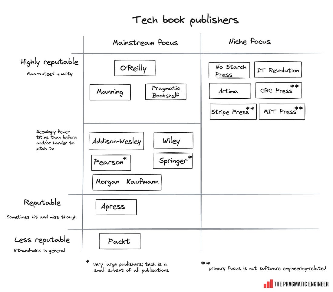 The bottom of this article could be cut off in some email clients. Read the full article uninterrupted, online. 1. Pitching to publishersIn late 2019, I was an engineering manager at Uber, the ridesharing app. For the first time in my career, I was a manager of managers: suddenly, I had “skip level” software engineers, and it was here that the inspiration came to write a book that provides some advice and observations for these tech professionals. During a 1:1 catchup with a new joiner skip-level engineer, they asked about getting up to speed in the workplace faster. They were at the Software Engineer 2 (L4), and wanted to figure out how to get to the Senior engineer level (L5A at Uber). I thought it would’ve been nice to give them a book with a bunch of pointers about what it takes to become an effective software engineer in this environment. With that inspiration to write a book about professional growth at large tech companies and startups, I looked for publishers who could help make it a reality. I pitched my book to 3 publishers behind the highest quality tech books in the industry – O’Reilly, The Pragmatic Bookshelf, and Manning. O’Reilly and The Pragmatic Bookshelf passed, but Manning said yes. I learned a lot by working with a publisher: the process of preparing a book to be ready for sale is much more involved than I’d assumed! I even came to appreciate why publishers may keep up to 85-90% of sales revenue, with authors typically getting 7-15% of royalties from print sales. The chart below sets out the publication process at a typical tech book publisher, from the author pitching their idea for a book, all the way through to its launch: Unfortunately, after three months with Manning and one editorial review, it was clear that the publisher and my book weren’t a good match. At the time, Manning had a very opinionated template for creating books which I felt pushed my own in a direction I wasn’t happy with: I felt the book would be dumbed down, and that following some of the guidance would weaken it. Also, I was less comfortable with some of the conditions and feared my hands could be tied if I wanted to share draft material online,. Also, I would not be able to choose the book title. So, we parted ways. You live and learn! I shared more details about my experience of working with publishers in this article, including the financials of choosing a publisher as a writer. 2. Self-publishingThe biggest downside of not having a publisher is the lack of deadline pressure. Below is the rough structure I used for writing my book: