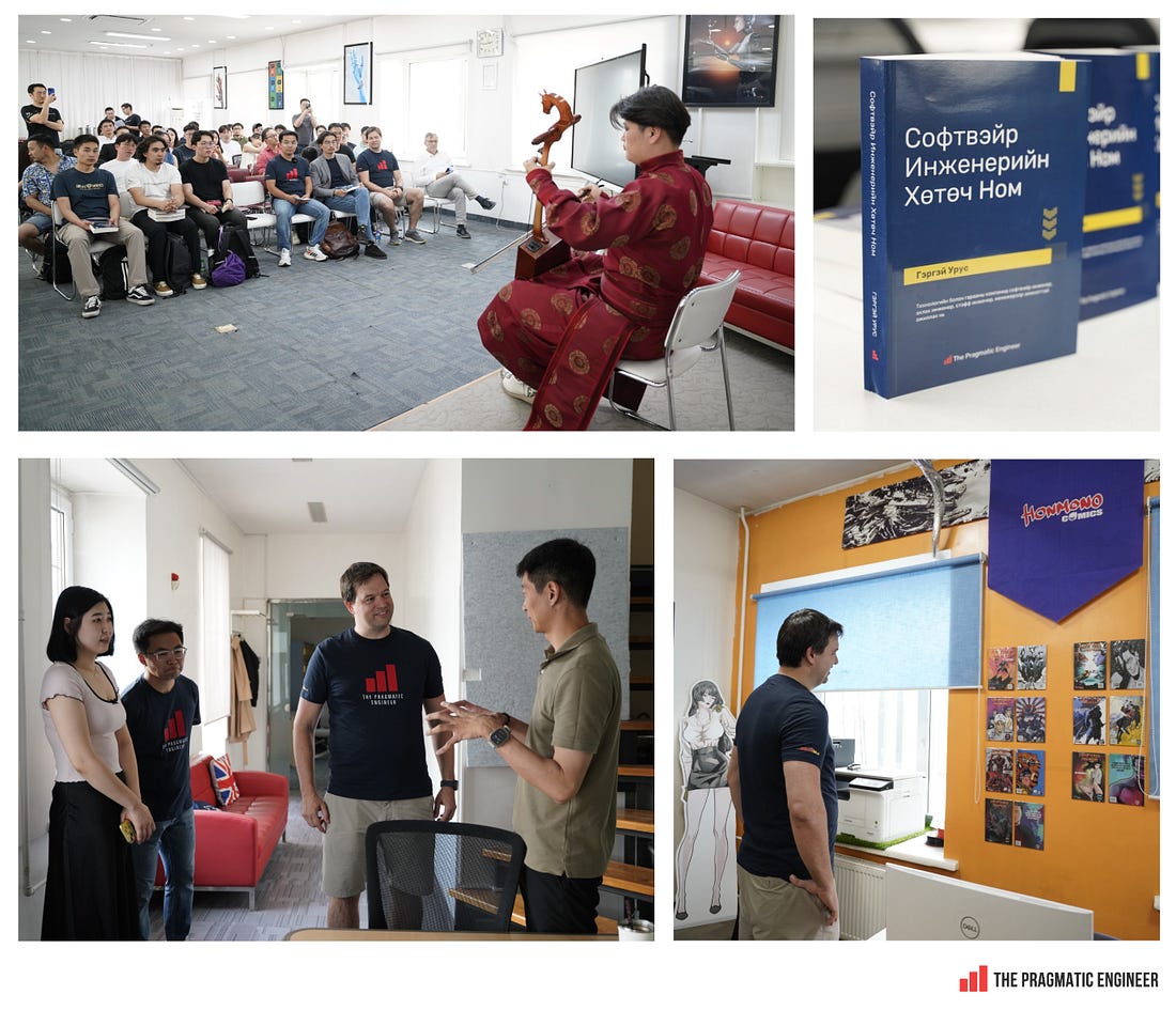 Still, the biggest benefit of sharing drafts was that I got nearly as much feedback from social media users as from beta readers. Procrastination is real – deal with itWriting “the book” I’d always wanted made me freeze at times: it was something I’d never done before, it was a large project, and I wanted to get everything right. In the end, as with software, “done is better than perfect”. Just like when working on a big software launch, the best way to make progress is to forget about how many people might use the product, and to just focus on the next task to complete… then the next… then the next. It was amusing to remind myself that tech products I’d worked on were used by many times more people than the book could ever hope to reach – so why procrastinate? Plus, mistakes can be fixed with ebooks, they are trivial to do with a re-publish. Of course, this isn’t possible in the same way with print books, but print-on-demand means issues can be resolved in future copies. 3. Traveling to Mongolia to meet the startup which translated my bookAn unexpected highlight of publishing the book was ending up in Mongolia in June of this year, at a small-but-mighty startup called Nasha Tech. This was because the startup translated my book into the Mongolian language. Here’s what happened: A little over a year ago, a small startup from Mongolia reached out, asking if they could translate the book. I was skeptical it would happen because the unit economics appeared pretty unfavorable. Mongolia’s population is 3.5 million; much smaller than other countries where professional publishers had offered to do a translation (Taiwan: 23M, South Korea: 51M, Germany: 84M people). But I agreed to the initiative, and expected to hear nothing back. To my surprise, nine months later the translation was ready, and the startup printed 500 copies on the first run. They invited me to a book signing in the capital city of Ulaanbaatar, and soon I was on my way to meet the team, and to understand why a small tech company translated my book! Japanese startup vibes in MongoliaThe startup behind the translation is called Nasha Tech; a mix of a startup and a digital agency. Founded in 2018, its main business has been agency work, mainly for companies in Japan. They are a group of 30 people, mostly software engineers. Their offices resembled a mansion more than a typical workplace, and everyone takes their shoes off when arriving at work and switches to “office slippers”. I encountered the same vibe later at Cursor’s headquarters in San Francisco, in the US. Nasha Tech found a niche of working for Japanese companies thanks to one of its cofounders studying in Japan, and building up connections while there. Interestingly, another cofounder later moved to Silicon Valley, and advises the company from afar. The business builds the “Uber Eats of Mongolia”. Outside of working as an agency, Nasha Tech builds its own products. The most notable is called TokTok, the “UberEats of Mongolia”, which is the leading food delivery app in the capital city. The only difference between TokTok and other food delivery apps is scale: the local market is smaller than in some other cities. At a few thousand orders per day, it might not be worthwhile for an international player like Uber or Deliveroo to enter the market.