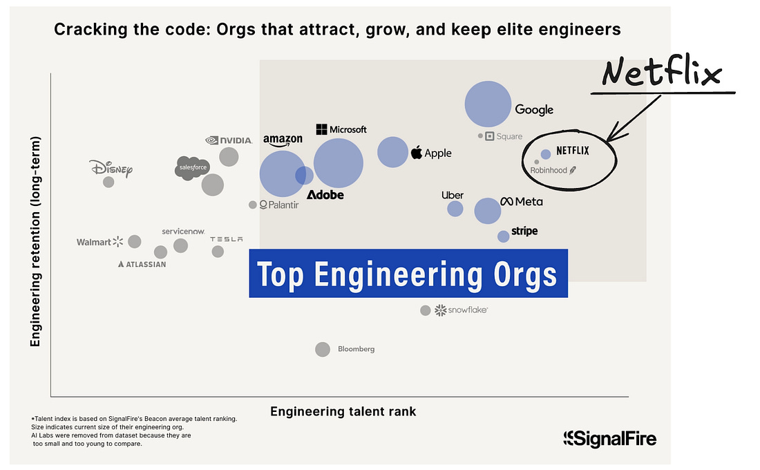 Netflix’s Engineering CultureGo inside Netflix’s engineering culture with CTO Elizabeth Stone, as she reveals how the company empowers teams to make bold decisions, learn from failure, and build at a global scale.Stream the latest episodeListen and watch now on YouTube, Spotify, and Apple. See the episode transcript at the top of this page, and timestamps for the episode at the bottom. Brought to You by• Statsig — The unified platform for flags, analytics, experiments, and more. Statsig enables two cultures at once: continuous shipping and experimentation. Companies like Notion went from single-digit experiments per quarter to over 300 experiments with Statsig. Start using Statsig with a generous free tier, and a $50K startup program. • Linear — The system for modern product development. When most companies hit real scale, they start to slow down, and are faced with “process debt.” This often hits software engineers the most. Companies switch to Linear to hit a hard reset on this process debt – ones like Scale cut their bug resolution in half after the switch. Check out Linear’s migration guide. — In this episodeWhat’s it like to work as a software engineer inside one of the world’s biggest streaming companies? In this special episode recorded at Netflix’s headquarters in Los Gatos, I sit down with Elizabeth Stone, Netflix’s Chief Technology Officer. Before becoming CTO, Elizabeth led data and insights at Netflix and was VP of Science at Lyft. She brings a rare mix of technical depth, product thinking, and people leadership. We discuss what it means to be “unusually responsible” at Netflix, how engineers make decisions without layers of approval, and how the company balances autonomy with guardrails for high-stakes projects like Netflix Live. Elizabeth shares how teams self-reflect and learn from outages and failures, why Netflix doesn’t do formal performance reviews, and what new grads bring to a company known for hiring experienced engineers. This episode offers a rare inside look at how Netflix engineers build, learn, and lead at a global scale. Interesting details about NetflixA “top” company for engineering talent and retention. From this report by Signal Fire, Netflix is in the far right corner of this chart, meaning the company hires strong engineering talent, and retention is above industry average: