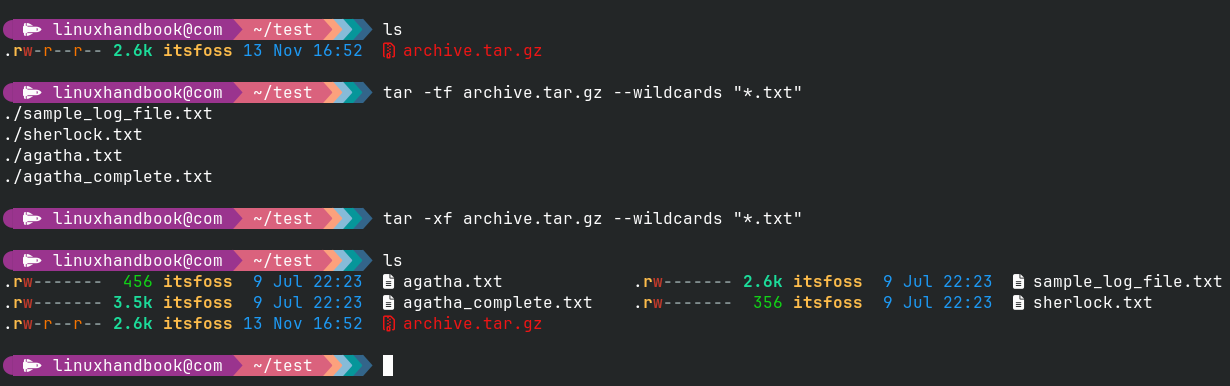 Now, extract the selected files. tar -xf archive.tar.gz --wildcards "*.txt"