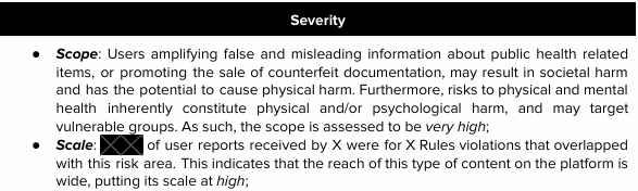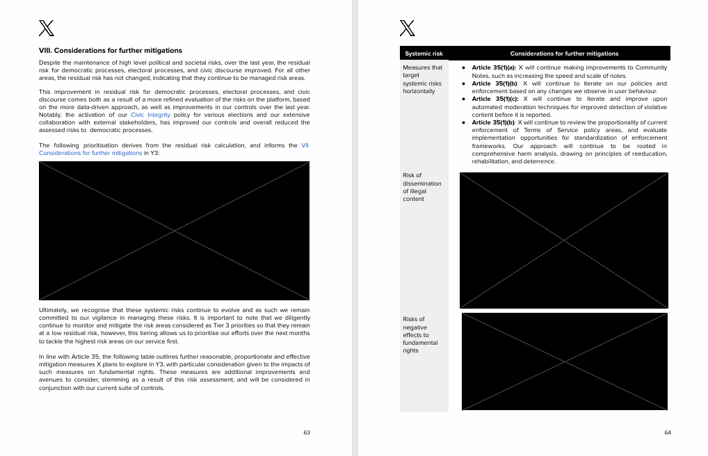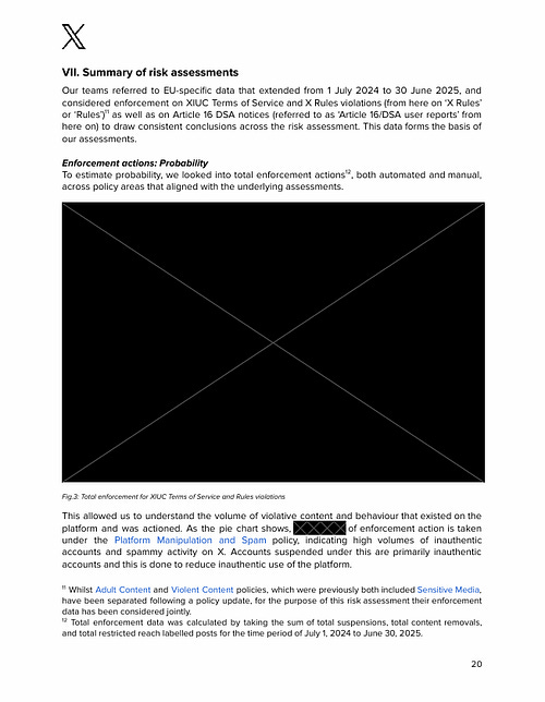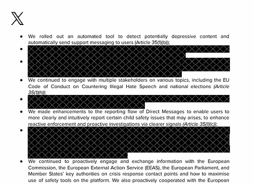 In addition to the “DSA transparency reports” on its content moderation about which I’ve written previously, X, like other major online platforms, also submits “systematic risk assessment” (SRA) reports to the EU to comply with its obligations under the Digital Services Act. These risk assessments are supposed to help the platform precisely in designing its “content moderation,” in order to mitigate “systemic risks” arising from the use of the platform: for instance, due to the spread of “harmful misinformation”, as X’s latest report puts it (p. 53). That report can be found at X’s “Transparency Center” here. The above excerpt comes from it. As you can see, the report is redacted! These are not the only redactions. X’s 2025 SRA report is in fact redacted throughout and very heavily redacted in parts. The above excerpt comes from p. 12. Readers will be reassured by knowing that X “continued to proactively engage and exchange information with the European Commission, the European External Action Service (EEAS), the European Parliament, and Member State’s key authorities…”. Thank goodness that the “Twitter Files” exposed some occasional contacts with the US government and that, by Executive Order or something like that, this shall never happen again! But that just by the by on the unredacted bits… Here, for instance, is what p. 20 looks like. And here are pp. 63-64. In particular, it is evident from a perusal of the document that all quantitative data — for instance, on reported content and X “enforcement action” — has been hidden. See, for instance, the below passage on misinformation as “public health risk.” The redacting of the data on X “enforcement actions” — i.e. content removals, withholding of content in certain jurisdictions, and restriction of visibility — means that I cannot do the kind of analysis I have conducted in the past and that shows that “visibility-filtering” is precisely the main form taken by censorship on X. My analysis was based on X’s 2024 “DSA Transparency Report.” That report showed that X took “enforcement action” on an astounding 226,350 of 238,108 items reported to it by EU-based “individuals and entities” in the reporting period. Since 40,331 items were deleted and access to 62,802 items was withheld in the EU, this means that 123,217 items, over half, “merely” had their visibility restricted. But X’s subsequent “DSA Transparency Reports” also hide the aggregate data required to infer the extent of “visibility-filtering”: not by redacting the aggregate figure but simply by not mentioning it at all! Perhaps I struck a chord… X’s practice of redacting its “systematic risk assessment” (SRA) reports is not typical, by the way. A full archive of such reports is available here. Based on some quick sampling, the only other company that I have found redacting its reports is TikTok. The Facebook, LinkedIn and Google/YouTube reports that I have consulted contain no redactions. Readers are welcome to look for themselves, and I would, of course, welcome feedback. The publicly available versions of X’s 2023 and 2024 SRA reports are also redacted. Earlier this year, the watchdog organization Follow The Money asked the European Commission for access to the unredacted versions. On the organization’s own account (registration required), the Commission’s response was not only to deny the request, but also to change its internal rules to create a presumption of confidentiality for DSA-related documents. So much for “transparency” — both that of X and that of the European Commission. Robert Kogon's Newsletter is free today. But if you enjoyed this post, you can tell Robert Kogon's Newsletter that their writing is valuable by pledging a future subscription. You won't be charged unless they enable payments. |