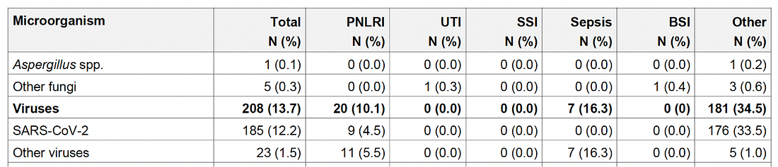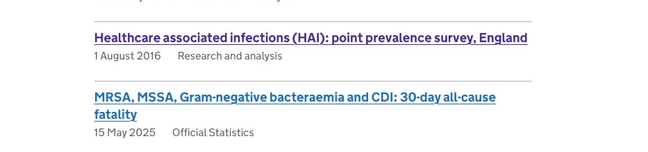 We begin by reviewing the list on the Scratch Pad to identify hospital-acquired respiratory viral infections (RV HAI or HCAI). Just so that we are clear, we wrote: “RV HAIs are associated with longer hospital stays and higher ICU admission rates. In a cohort of 1,700 patients with RV HAI, patients had longer mean lengths of stay (e.g., 21 days vs. 5 days in community-acquired cases). These patients were older, had pre-existing respiratory disorders or were immunosuppressed and faced greater RV HAI risk. They were also likely to exhibit typical respiratory infection symptoms, which could delay diagnosis. RV HAIs are also associated with significantly higher mortality compared with community-acquired cases, often with several-fold greater risk. Among patients who acquired influenza in hospital, 21.7% died compared with 4% among patients with negative test results. So, roughly 1 in 5 hospital-acquired influenza patients die in hospital, compared with about 1 in 25 in similar hospitalised patients who do not acquire influenza. The odds of in-hospital death were significantly higher for those with HAI-influenza, even after adjusting for age and comorbidities.” So in the TTE office, we tried to find some joined-up government programmes dealing with the problem through the eyes of two old geezers who’ve seen a few winters and too many “initiatives.” Joined-up government wouldn’t start with a press release, it’d start with the same set of numbers on everyone’s desk. All are looking at the same severity data, not each running their own pet dashboard and panicking on different days—the kind of system that works so smoothly, no one notices. Just after the Covid era, we laboriously estimated the likely impact of COVID-19-associated HAIs in the UK; a conservative estimate was 40%. No one could tell us how many of these subsequently died in the hospital. Wales, Scotland and Northern Ireland provided us with data, assistance and clarification. NHS England, twisted, evaded, dodged and finally came up with the answer: “We do not hold granular hospital admission data reported by days of positivity to SARS-CoV-2 since admission, or data going back to March 2020.” They had no idea how many folks in England were admitted with a negative test, which subsequently turned positive after eight or more days in hospital - Our wildly optimistic timeline for capturing all RI HAIs. Fast forward to the current automated electronic bulletins from public health bodies, and we still haven’t found evidence of a coordinated programme to address respiratory viral HAIs, despite the “Superflu” nonsense. Joined-up government wouldn’t be a shiny “zero tolerance” slogan. It’d be dull, practical, and agreed before the wards fill up. Trying to find the joined-up government programs We reviewed the websites of the three obvious candidates for tackling HAIs: DHSCS, Scare Agency, and NHS England. Of these, the only credible source was the UKHSA’s page on HCAIs, published in July 2014 and last updated in September 2023. The website is the usual government mess of information. Information posted in May 2025 has not been updated since 2023. The point prevalence survey link dates back to 2016, even though the survey’s latest update states 2023. Despite this mess, we pressed on to find the 2023 publication After locating the 2023 point-prevalence survey (PPS) on HCAIs, we searched the document and identified five hits for “virus”. Table 3.2.4.9. Reports “Microorganisms isolated from HCAIs per diagnosis site, PPS England 2023” (see pdf page 40). PNLRI stands for Pneumonia or lower respiratory tract infection, UTI is a urinary tract infection, SSI is a surgical site infection, and BSI is a Bloodstream infection. Aside from its sell-by date, can you see anything unusual in the data? No? Then have a look at this screengrab from pdf page 42: Viruses account for 13.7% of HAIs, primarily due to SARS-CoV-2, and only 10% of PNLRI. Given the number and fuss around “superflu” and annual hospitalisations, panic, fear, etc., we are unable to understand how many HAIs are caused by respiratory viruses, regardless of agent and how many end in deaths, We also can’t tell if any of them are investigated, and how it is possible that only 13.7% of HAIs in 2023 involved viruses (mostly Covid), with a small proportion not investigated? We also don’t know how many of these were co-infections with other viruses or with superimposed bacterial pneumonia in a selected population highly vulnerable to these pathogens. From this 2023 report, you can see the dead hand of the NHS bureaucracy. Concentration on bacteria (Klebsiella, Pseudomonas, etc.). It ignores the worst-case killers, which MSM, Ministers, authoritarians, modellers and charlatans united indicated as the winter devil. We did not want to jump to conclusions, so before Christmas, we submitted FOI requests to UKHSA, DHSC, and NHSE. We fired them off to all three at the same time to avoid the “pass the parcel” game we have been frequently subjected to (“we do not deal with HAIs ask the other bodies”). They’d look pretty silly if they all answered this at the same time, would they not? Our requests to all three bodies were 100% identical: Subject: Programme for VIRAL RESPIRATORY hospital-acquired infections Do you have a programme or standard operating procedure to identify and minimise the consequences of VIRAL RESPIRATORY hospital-acquired infections (HCAIs)? If so, can you point me to it, please? If so, do you have a programme or standard operating procedure to identify and minimise the consequences of INFLUENZA hospital-acquired infections (HCAIs)? If so, can you point me to it, please? If so, do you have a programme or standard operating procedure to identify and minimise the consequences of SARS-CoV-2 hospital-acquired infections (HCAIs)? If so, can you point me to it, please? We await the This post was written by two old geezers who do not
