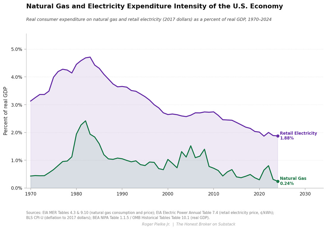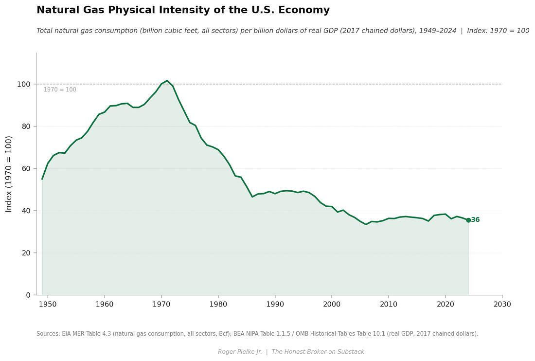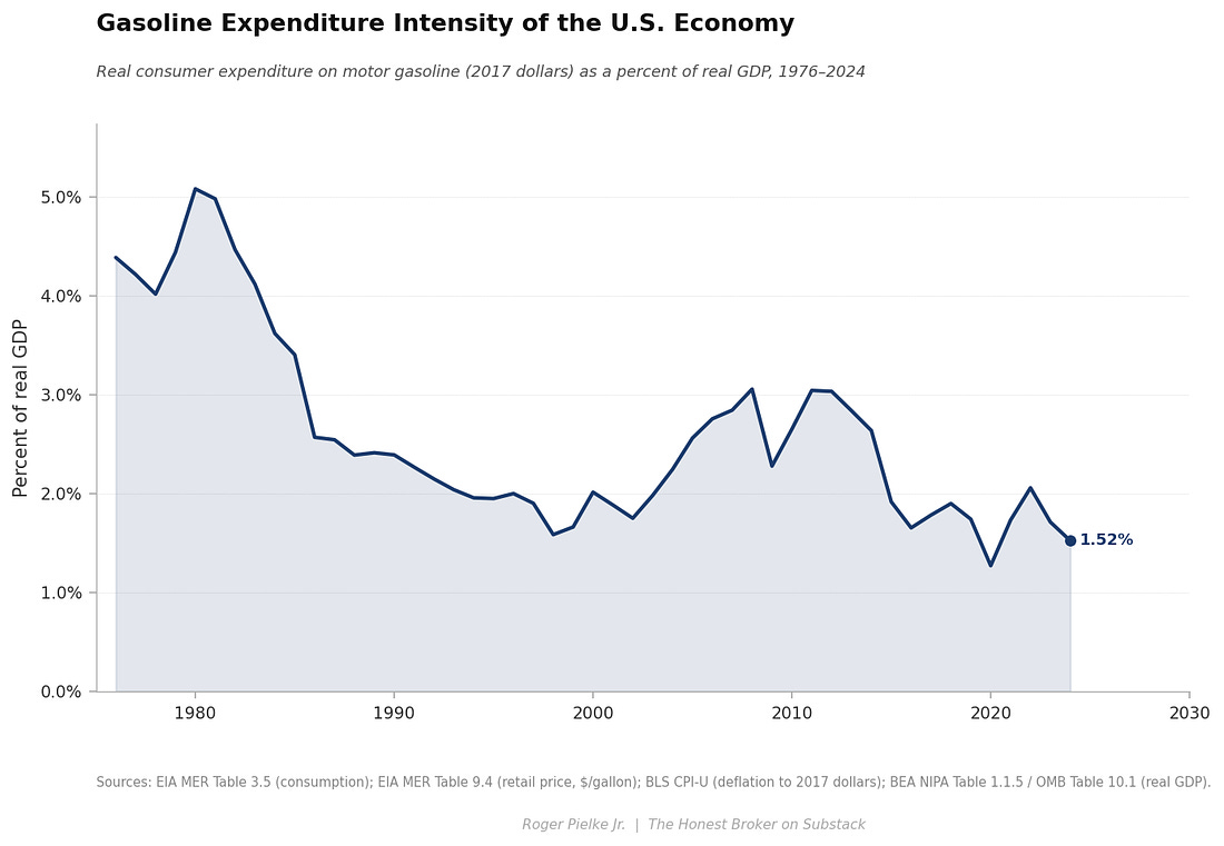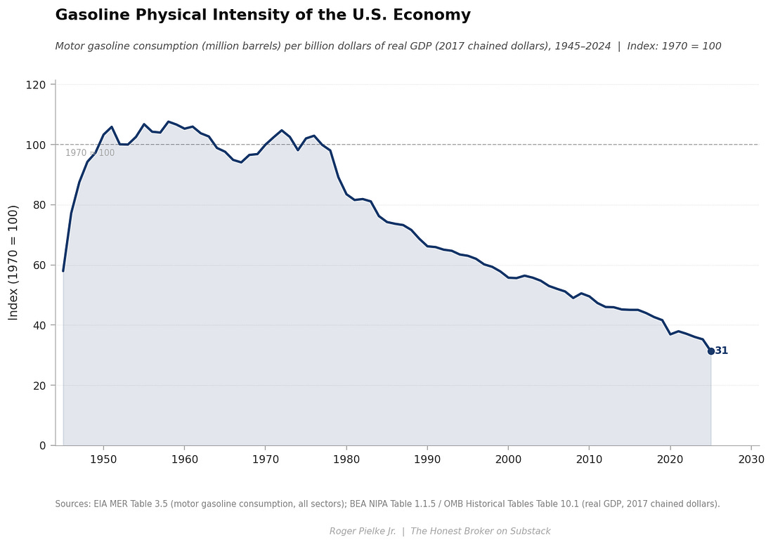 Today kicks off a three-part series here at THB focused on the energy intensity of the U.S. economy. Energy intensity is a key factor of the Kaya Identity and one of the only levers available to accelerate the decarbonization of the economy.¹ One of the key takeaways from the data reviewed in this series is that the U.S. economy has been decarbonizing for more than a half-century, independent of efforts to accelerate the rate of decarbonization. The series takes a detailed look at changes in energy intensity in the U.S. economy focusing on motor gasoline, natural gas, coal, electricity, nuclear, hydro, wind, and solar — which together account for essentially all energy consumption and direct energy expenditure. Today, in Part One, I take a look at fossil fuels. Specifically, gasoline, natural gas, and coal. I also take a look at electricity. Part Two looks at solar, wind, nuclear, and hydro power. Part Three looks at the broader lessons of the analysis, including what energy intensity might tell us about the geography of U.S. politics. Along the way there will be some surprising findings — at least there have been for me! The series is organized across three posts, which I’ll publish starting today and over the next week or so. Each post is organized around four top-line claims, so twelve in all. At the bottom of Part Three I’ll post an Excel file with all data from the figures in the series and links to original sources. Paid subscribers will be provided a Powerpoint file with all the figures. Let’s get to it . . . Throughout this series I’ll employ two different measures of energy intensity, each telling a unique story. Physical energy intensity refers to fuel volume or electrical generation in physical units (e.g., barrels, cubic feet, short tons, kilowatt-hours, etc.) per billion dollars of real GDP. Energy expenditure intensity is the real consumer (or utility) expenditure on a given energy source expressed as a percent of real GDP — It is a measure of the direct economic weight of energy on the economy. These metrics tell different, but related, stories.
