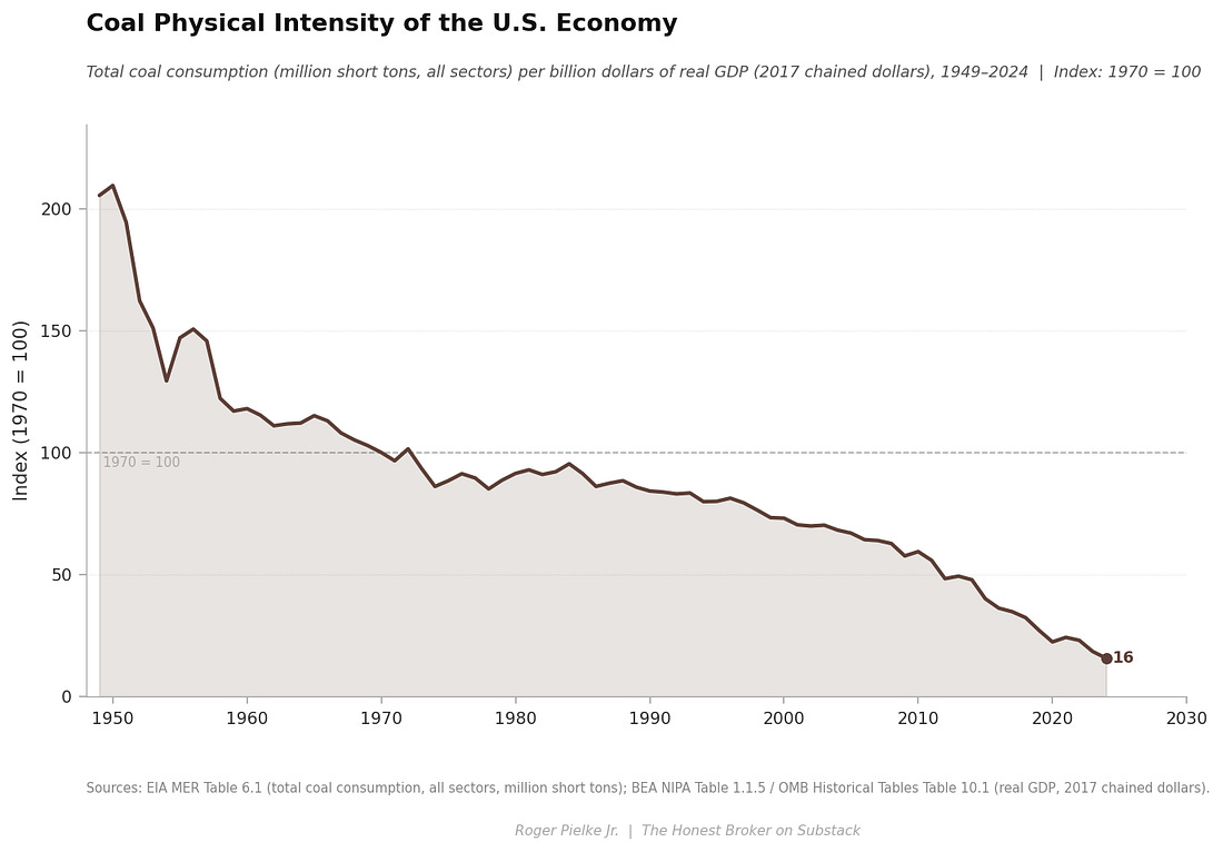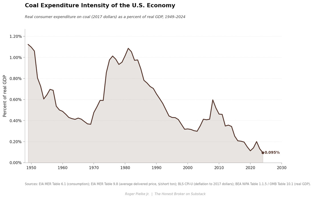 The figure below shows that gasoline physical intensity was fairly constant from about 1950 into the 1970s and has plummeted since — dropping by about 70%. The ~1950s to 1970s plateau is explained by the expansion of the U.S. automobile and trucking economy. Gas was cheap, cars were becoming more powerful, and there were few incentives for improving fuel economy. The 1970s energy crises changed all that — Geopolitics, technology, and policy combined to usher in the modern era of steadily declining gasoline physical intensity. More precisely, prior to the 1970s, vehicle miles traveled increased proportionately to GDP growth, and fuel economy per mile traveled remained constant. After that, miles traveled increased slower than GDP and fuel economy improved dramatically — from ~13 miles per gallon in the early 1970s to about ~27 miles per gallon in 1990. The next figure below, natural gas physical intensity of the U.S. economy, shows a dramatic increase from ~1950 into the 1970s, followed by a sharp decline into the 1980s followed by a slower decline and plateau after the 2010s. For natural gas in the U.S. economy, the 1950s to the 1970s saw the build-out of the interstate pipeline system and the rapid displacement of coal in buildings and industry, resulting in gas consumption growing much faster than GDP, pushing intensity sharply upward. The reversal in the 1970s and early 1980s was in large part driven by policies, including price controls that produced supply shortages. At this time the view of energy experts and the federal government was that the nation was going to soon run out of natural gas, prompting policies that promoted reducing reliance on gas. After deregulation and the advent of highly efficient combined-cycle gas power plants, gas consumption recovered, but within a more efficient U.S. economy. The shale revolution following the early 2000s motivated coal-to-gas switching in electricity, at the same time that overall electricity demand was flat, resulting in the recent plateau in natural gas physical intensity — but that era may now be over. The next figure, below, shows coal physical intensity of the U.S. economy. The story here is one of inexorable decline. Coal is a footnote in the U.S. energy economy, which we will return to below. The dominant drivers of the long-term decline in the physical energy intensity of fossil fuels were the price shocks of the 1970s, policy making in response, technological change, and the long-run structural shift of the U.S. economy away from energy-intensive manufacturing and toward energy-light services and information. Fossil fuel expenditure intensity — direct expenditures on these sources as a proportion of the economy — tells a related, but more complex story. Trends in the physical intensity of fossil fuels appear comparatively simple because they are shaped by slow-moving, largely one-directional forces such as improvements in the efficiency of using fuels, changes in the technologies of energy consumption (think cars, computers, light bulbs), energy policies that typically impose changes over longer terms (like CAFE standards, power plant emissions regulations), and the relatively slow growth of U.S. energy consumption of recent decades. Expenditure intensity, in contrast, results from volatile prices resulting from factors related to the global markets for supply — such as oil shocks due to geopolitical conflict and the short-term rise and fall of commodity prices. The result is that the underlying physical relationship between energy use and economic output evolves more smoothly over time, while the economic burden of energy rises and falls in discrete episodes linked to the broader global economy. In the figure below, you can see that gasoline expenditure intensity peaked at 5.1% of GDP in 1980 — meaning that about $1 out of every $20 of spending in the overall U.S. economy went to paying for gasoline. By 2024 had fallen to ~1.5%, a 70% decline in the economic burden of gasoline spending.³ Even though the past decade has seen a historically low share of gasoline spending in the overall U.S. economy, the post-COVID increase — from ~1.3% to ~2.0% — became politically salient, a topic I’ll return to in detail in Part Three. Coal’s expenditure intensity peak in 1949 might be considered the inflection point between the industrial revolution and the modernization of the second half of the twentieth century. Throughout the first half of the last century, coal was the primary fuel for railroads, heated buildings, and industry. The rapid decline that followed reflects the postwar displacement of coal by oil and natural gas across the economy. The second coal expenditure peak in the early 1980s occurred for different reasons: a build-out of coal-plant construction coinciding with the economy-wide energy price shocks of the 1970s, which raised mining, transport, and capital costs. It seems ancient history now, but in 1978 Congress passed the Powerplant and Industrial Fuel Act of 1978 which mandated that coal serve as the primary fuel for all new power plant construction, partly motivated by concerns that natural gas supplies would run dry and petroleum was geopoltically risky. The long decline in coal expenditure intensity after the mid-1980s was driven by a collapse in coal costs as the highly productive surface mining in Wyoming’s Powder River Basin combined with rail deregulation — which lowered the costs of transporting low-sulfur coal from Wyoming to the east coast — and higher rates of power-plant utilization. The brief resurgence around 2008 reflects a surge in global coal prices — driven by China’s rapid expansion of coal consumption. The sharp drop thereafter that marks the shale-gas transition, which made natural gas cheaper than coal, thereby reducing both demand for coal and its price. The slower decline in electricity’s physical intensity than for fossil fuels reflects the increasing electr