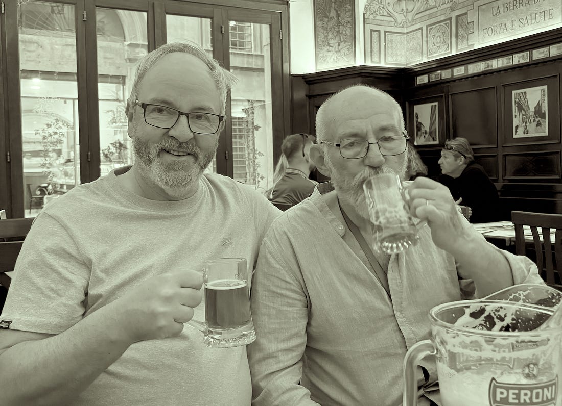 Over time, it has preserved its traditional character rather than chasing modern trends. The ambience is warm and nostalgic, with dark wood interiors, vintage photographs, and a lively, communal feel. It’s often busy and a bit noisy, but that’s part of its charm—an authentic Roman atmosphere where conversation, history, and beer flow together naturally, and two old geezers can be found having an Ale.